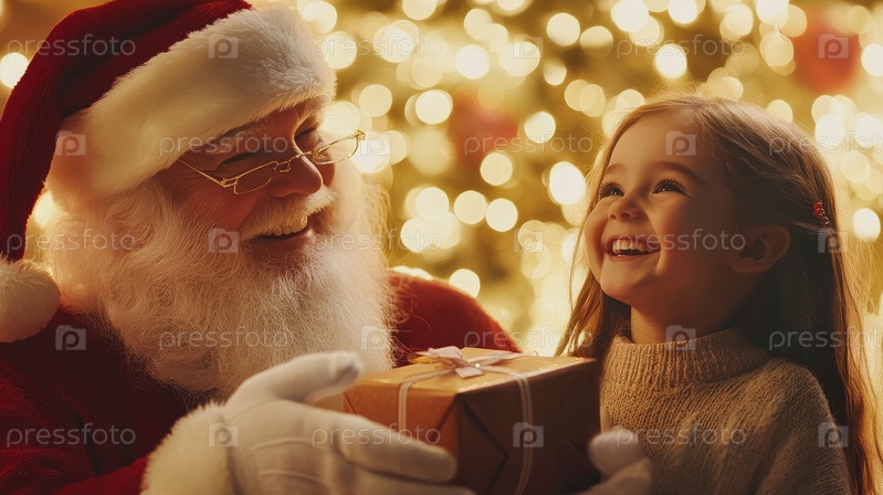 Маленькая девочка получает подарок от Санта-Клауса возле красиво украшенной рождественской елки, олицетворяющей волшебство и радость праздника