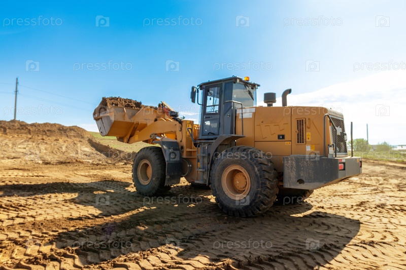 На этом снимке изображен мощный бульдозер, активно перемещающий землю на строительной площадке, что демонстрирует мощность и эффективность тяжелой техники