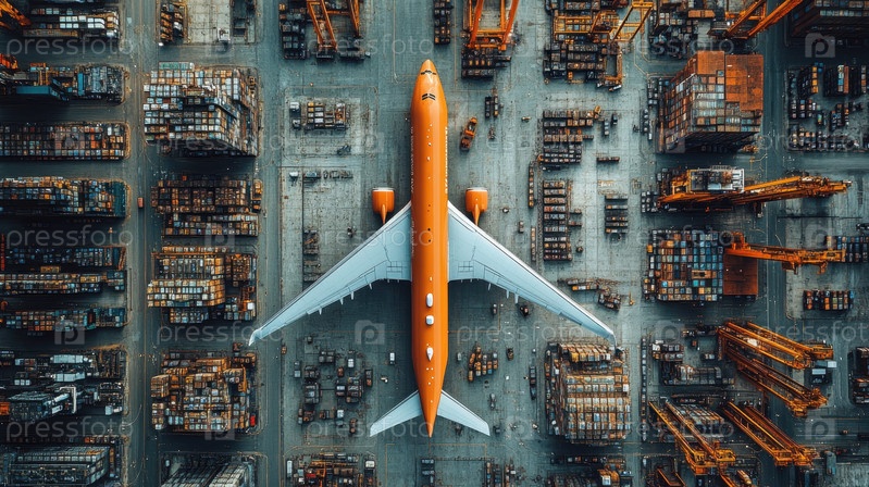 Вид с воздуха на большой грузовой самолет в оживленном логистическом центре, окруженный грузовыми контейнерами и промышленными кранами, символизирующий мировую торговлю и воздушные грузоперевозки