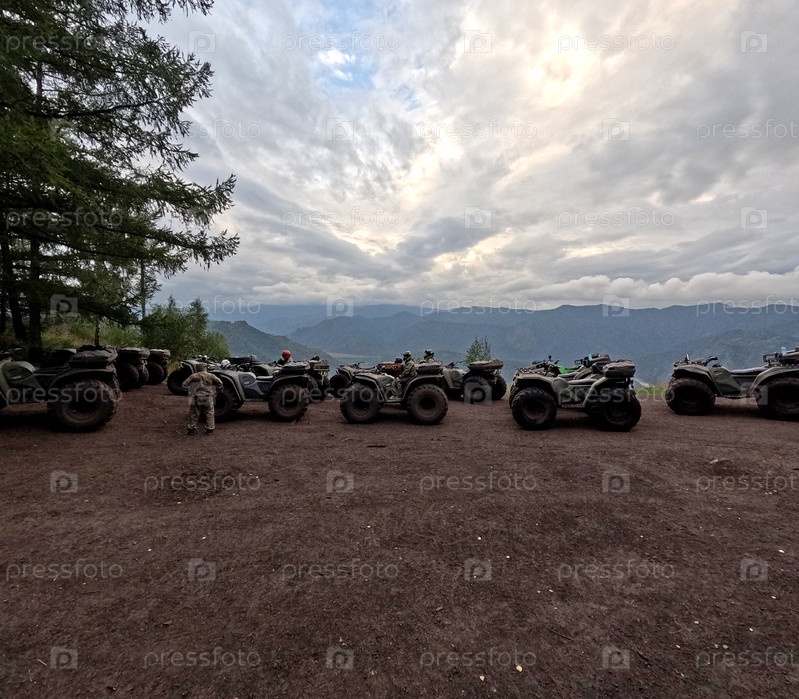 Группа на квадроциклах в горах Алтая. Чемал. Республика Алтай. A group on quad bikes in the Altai mountains. Chemal. The Altai Republic