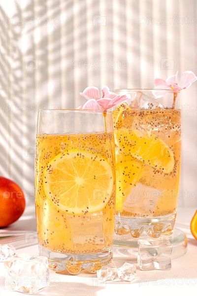 Детокс-диета и концепция потери веса. Диетический веганский коктейль с семенами чиа, апельсином, лаймом, фиалкой и льдом. Летняя вечеринка и реклама здорового образа жизни. Летний баннер и шаблон экрана