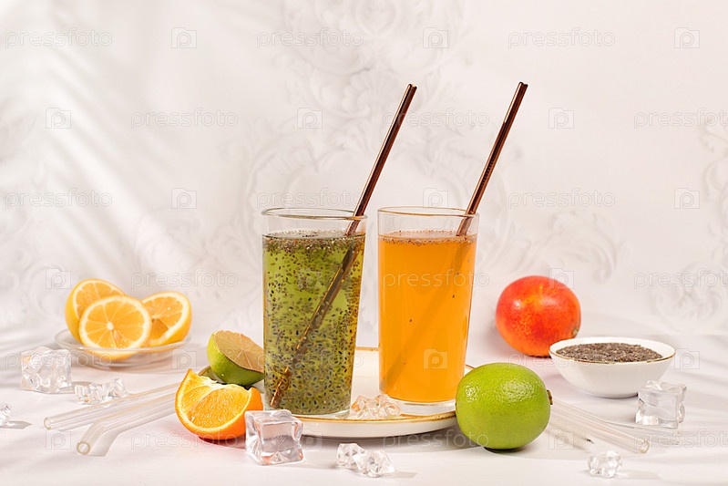 Диетический веганский коктейль с семенами чиа, апельсином, лаймом, фиалкой и льдом. Детокс-диета и концепция потери веса. Летняя вечеринка и реклама здорового образа жизни. Летний баннер и шаблон экрана