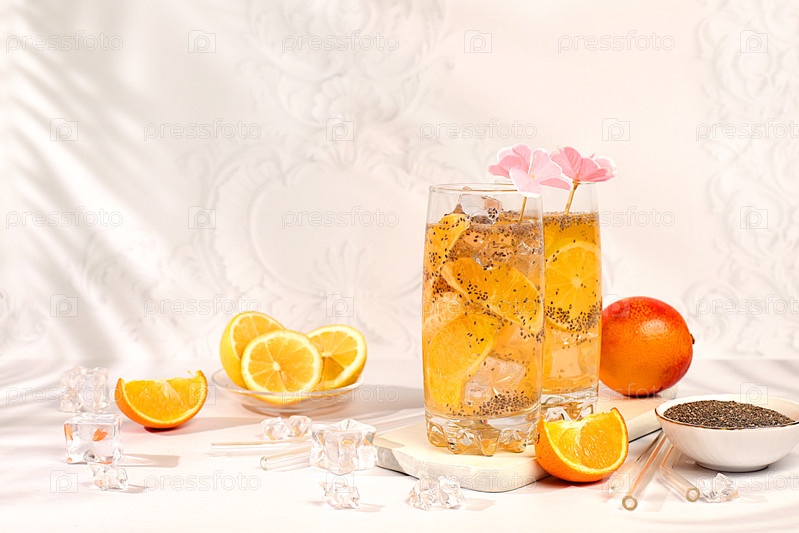 Диетический веганский коктейль с семенами чиа, апельсином, лаймом, фиалкой и льдом. Детокс-диета и концепция потери веса. Летняя вечеринка и реклама здорового образа жизни. Летний баннер и шаблон экрана