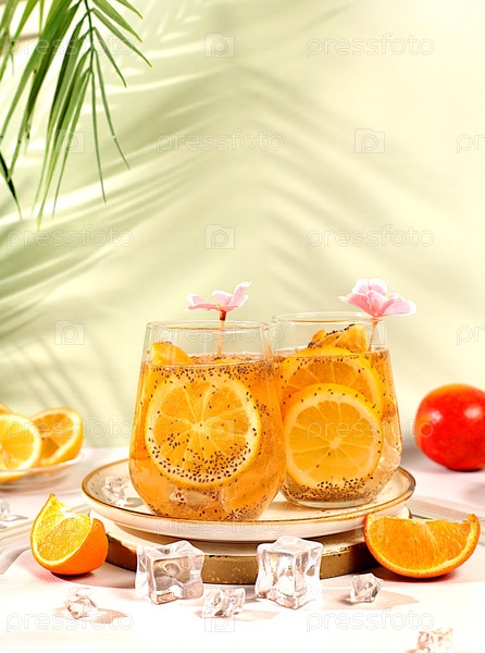 Детокс-диета и концепция потери веса. Диетический веганский коктейль с семенами чиа, апельсином, лаймом, фиалкой и льдом. Летняя вечеринка и реклама здорового образа жизни. Летний баннер и шаблон экрана