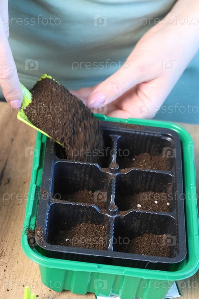 Женщина засыпает семена в ячейках пластикового контейнера землей. Мини-теплица для выращивания рассады. Косой угол