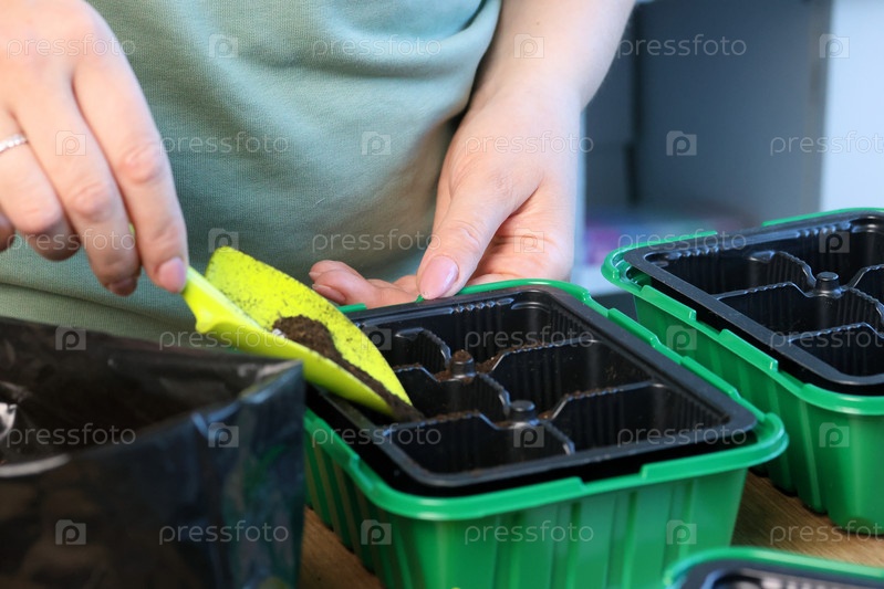 Женщина насыпает почву в ячейки пластикового контейнера. Мини-теплица для выращивания рассады. Крупный план. Косой угол