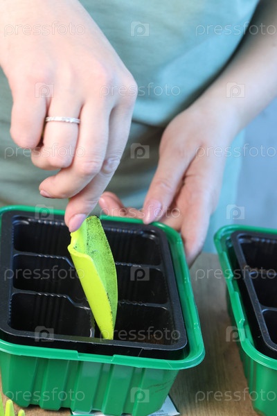Женщина насыпает почву в ячейки пластикового контейнера. Мини-теплица для выращивания рассады. Крупный план. Косой угол