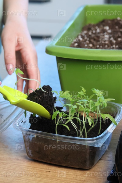 Женщина пересаживает рассаду томатов в пластиковый контейнер. Крупный план