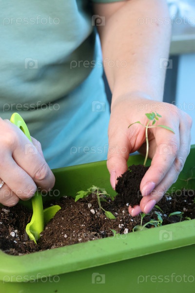 Женщина пересаживает рассаду томатов в пластиковый контейнер