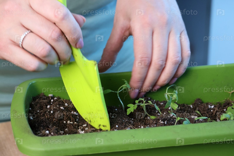 Женщина работает с рассадой. Рассада томатов в пластиковом контейнере. Крупный план