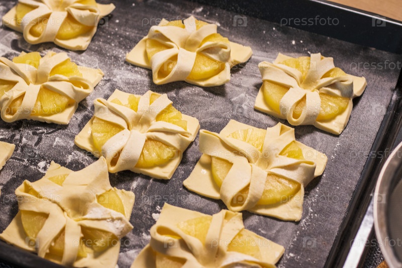 Фотография дольки ананаса, завернутой в слоеное тесто на противне. Еда