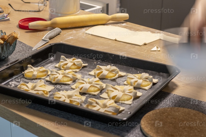 Фотография дольки ананаса, завернутой в слоеное тесто, на противне на кухонном столе, Дом