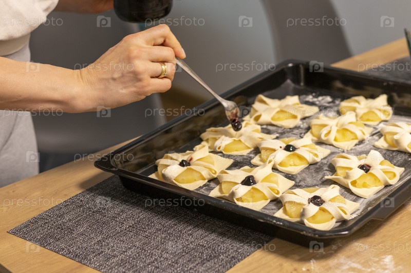 Женщина кладет вишню на верх слоеного теста, завернутого в дольки ананаса. Выпечка