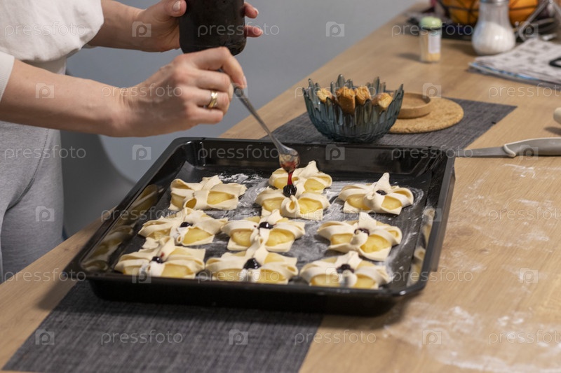 Женщина кладет вишню на верх слоеного теста, завернутого в дольки ананаса. Выпечка