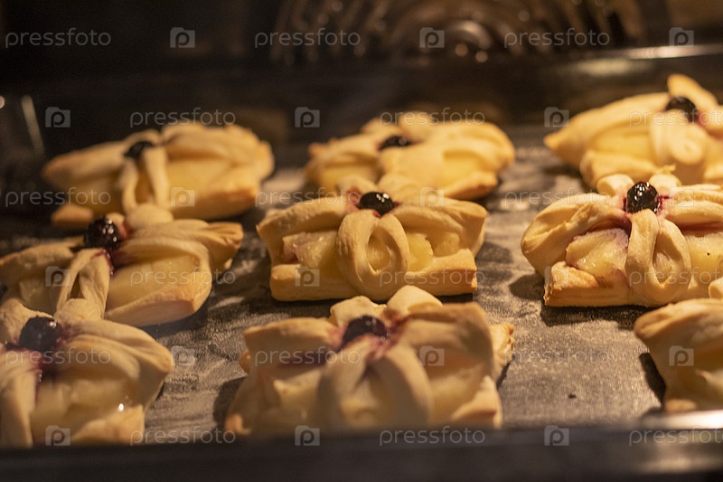 Слоеное тесто с завернутыми в него дольками ананаса и вишенкой сверху, на противне, запекается в духовке. Еда