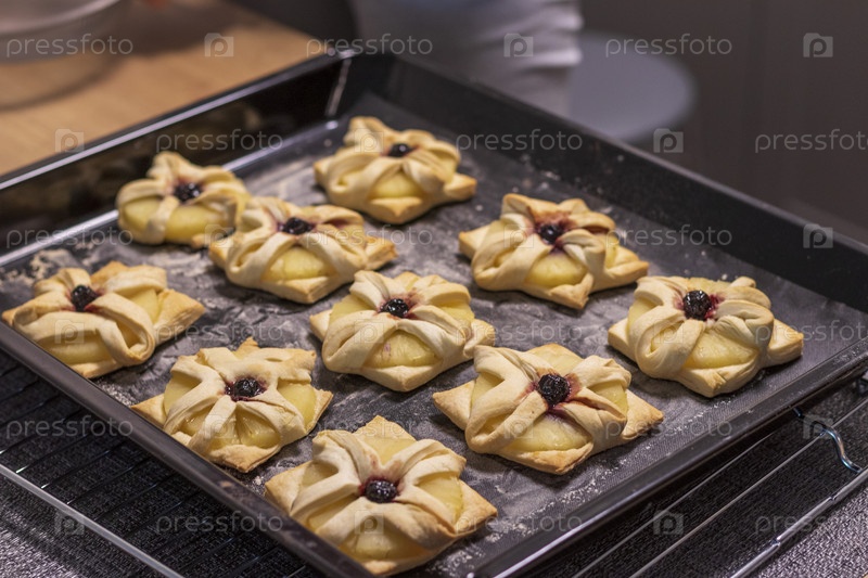 Женщина ставит противень со слоеным тестом, завернутыми в него дольками ананаса и вишенкой сверху из духовки на кухонную столешницу. Еда