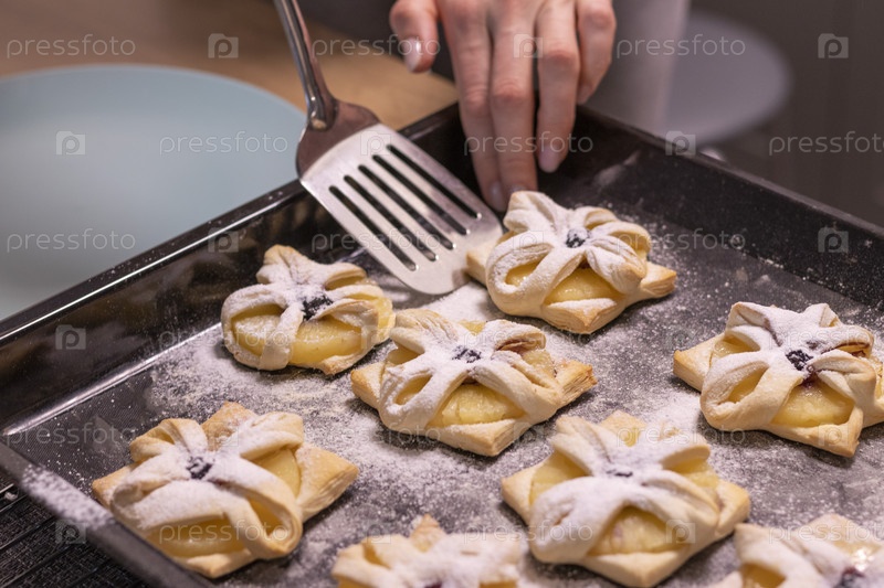 Женщина берет фруктовые пирожные с помощью лопатки с противня и кладет их на керамическую тарелку. Выпечка