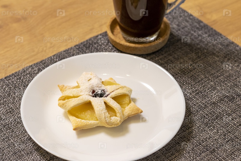 Свежеиспеченное фруктовое слоеное тесто на керамической тарелке рядом с горячей чашкой кофе. Завтрак