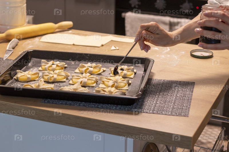 Женщина кладет вишню на верх слоеного теста, завернутого в дольки ананаса. Выпечка