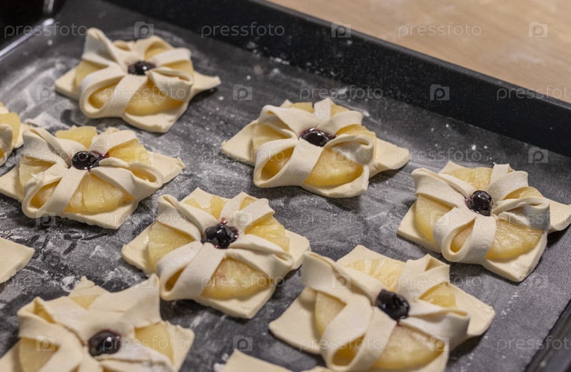 Слоеное тесто с завернутыми в него дольками ананаса и вишенкой сверху, на противне на кухонной столешнице. Выпечка