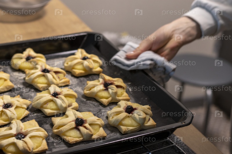 Женщина ставит противень со слоеным тестом, завернутыми в него дольками ананаса и вишенкой сверху из духовки на кухонную столешницу. Еда