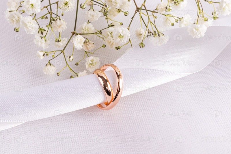 Два золотых обручальных кольца нанизаны на белую атласную ленту на белом тканевом фоне с шикарной гипсофилой. Копировальное пространство. открытка, приглашение