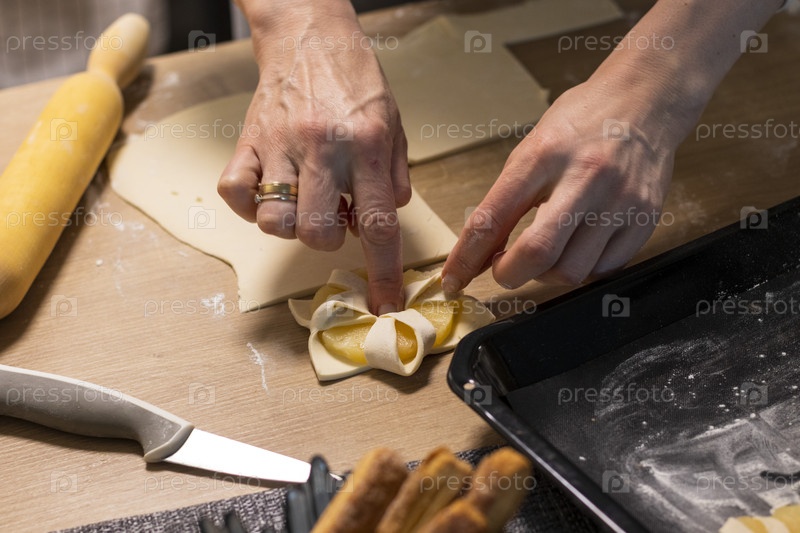 Женщина заворачивает ломтик ананаса в слоеное тесто. Выпечка