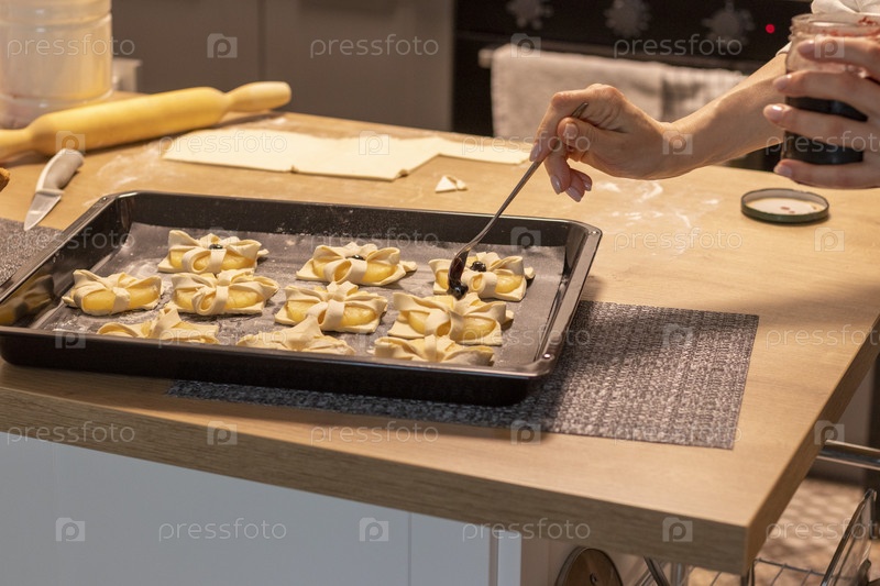 Женщина кладет вишню на верх слоеного теста, завернутого в дольки ананаса. Выпечка