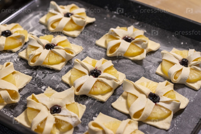 Слоеное тесто с завернутыми в него дольками ананаса и вишенкой сверху, на противне на кухонной столешнице. Выпечка