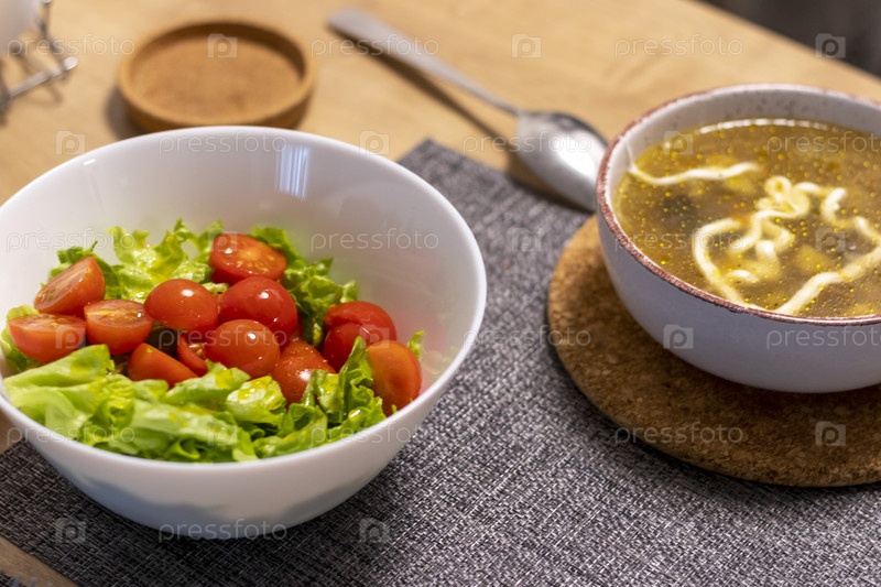 Бой с помидорами черри и листьями салата, бой с супом рядом. Еда