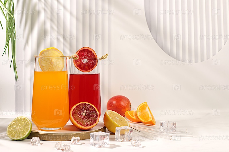 Апельсиновый сок, густой смузи и апельсины, грейпфрут, лайм, кровавый апельсин и лимон на элегантном кухонном столе. Детокс-диета и концепция потери веса, летние витаминные напитки, Современный натюрморт с цитрусовыми
