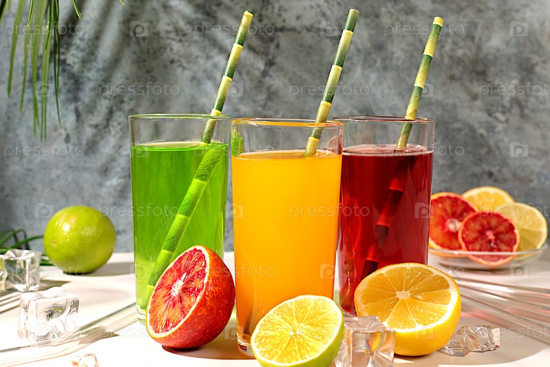 Апельсиновый сок, густой смузи и апельсины, грейпфрут, лайм, кровавый апельсин и лимон на элегантном кухонном столе. Детокс-диета и концепция потери веса, летние витаминные напитки, Современный натюрморт с цитрусовыми