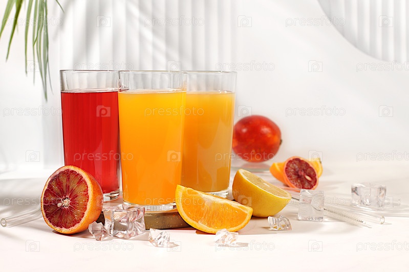 Современный натюрморт с цитрусовыми. Апельсиновый сок, густой смузи и апельсины, грейпфрут, лайм, кровавый апельсин и лимон на элегантном кухонном столе. Детокс-диета и концепция потери веса, летние напитки,