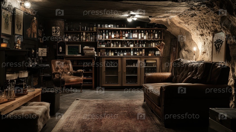 Уютный винтажный лаунж с коллекцией виски в деревенской обстановке