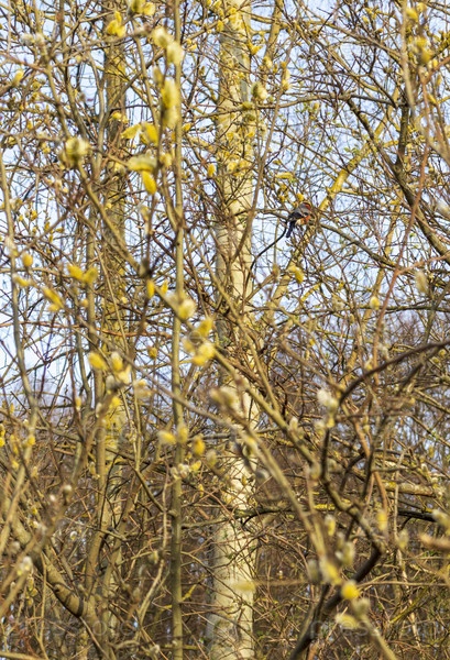 Снегирь в ветвях дерева с распускающимися почками. Природа
