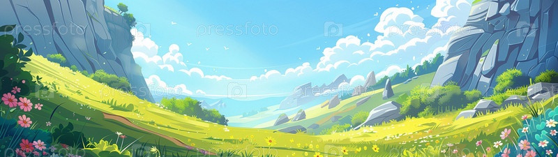 Летняя долина с цветами и деревьями. Панорамный рисунок