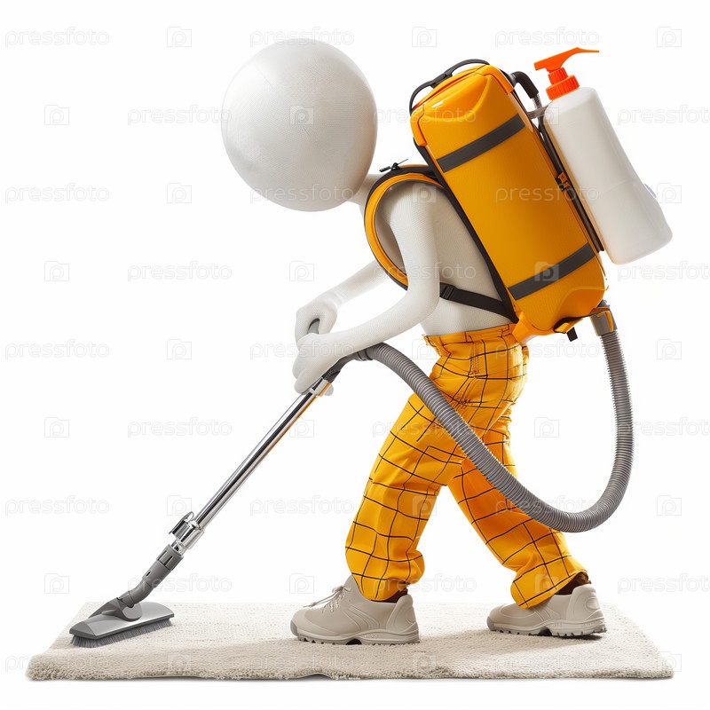 Стикмен пылесосит ковер, изолированный на белом фоне