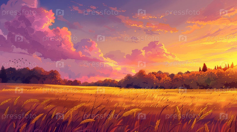 Осенний закат над полем зреющей пшеницы