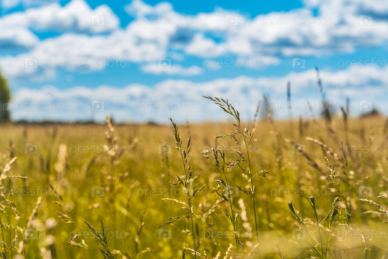 Солнечное поле высокой травы с голубым небом