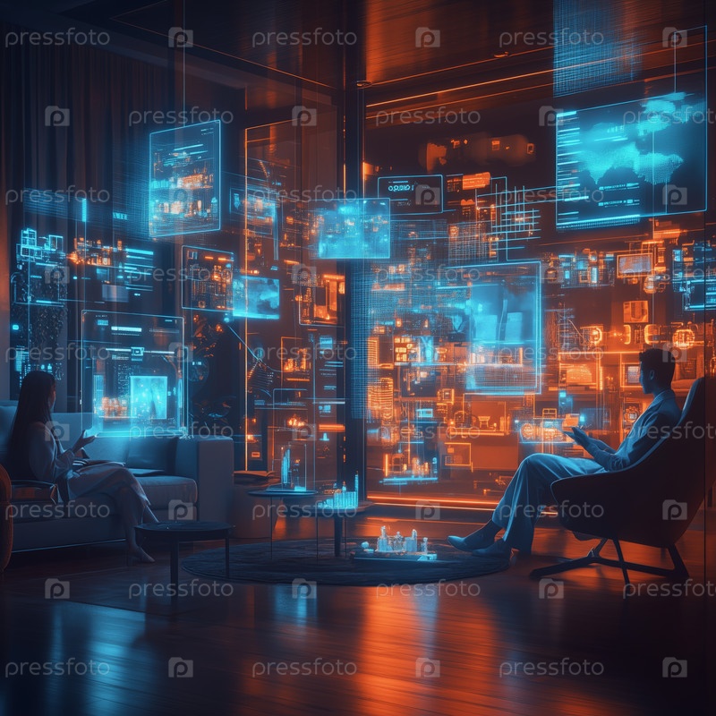 Человек взаимодействует со светящимся голографическим интерфейсом в футуристической городской квартире