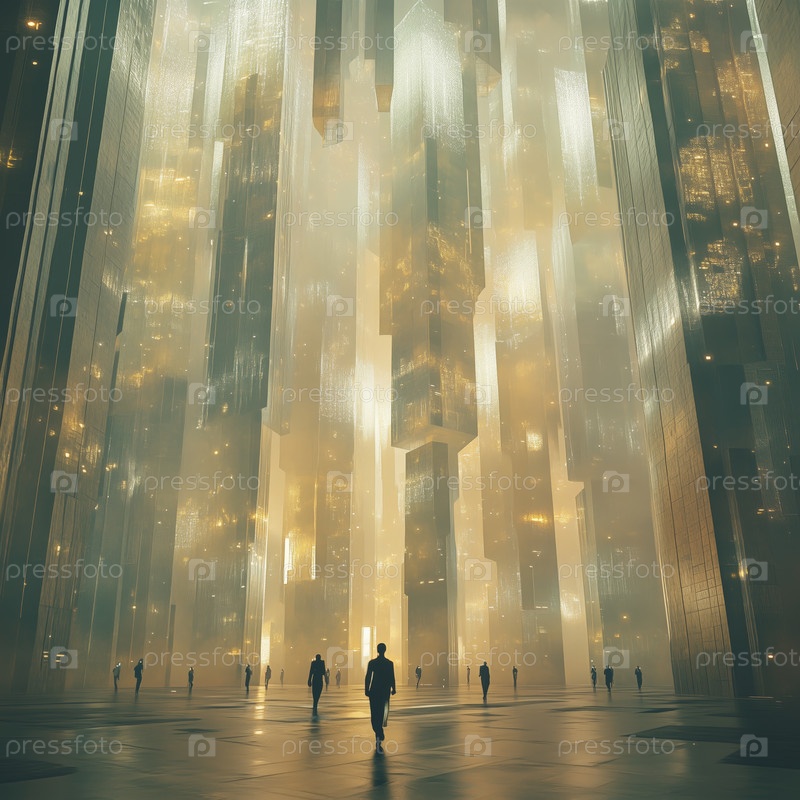 Силуэты, идущие сквозь светящиеся столбы света в сюрреалистическом тумане