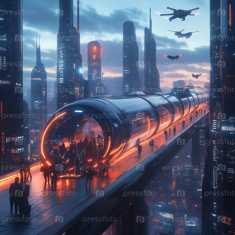 Футуристический город со светящимися скоростными поездами и шумными толпами