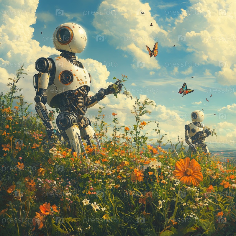 Футуристический робот взаимодействует с бабочками на ярком цветочном поле