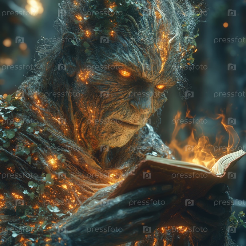 Древовидное существо читает светящуюся магическую книгу