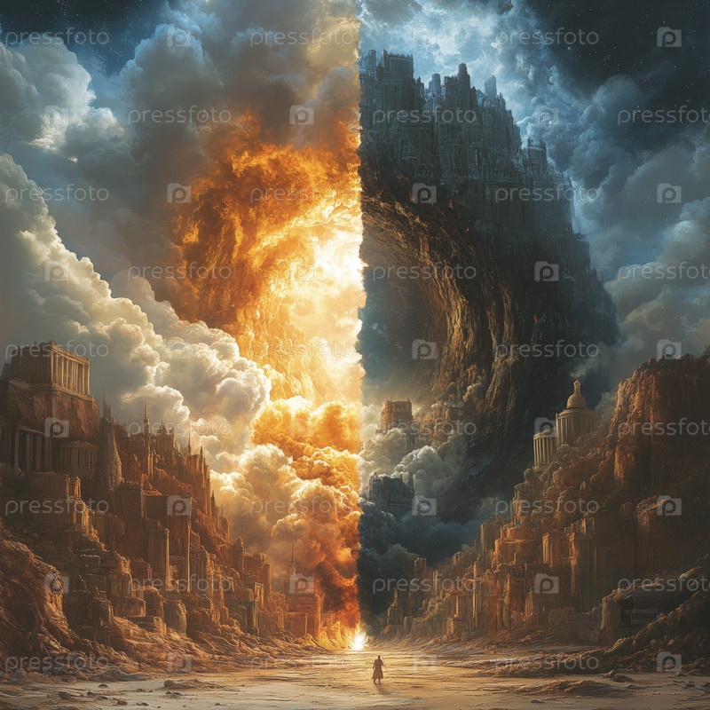 Драматический пейзаж, разделенный огнем и тьмой, с одинокой фигурой