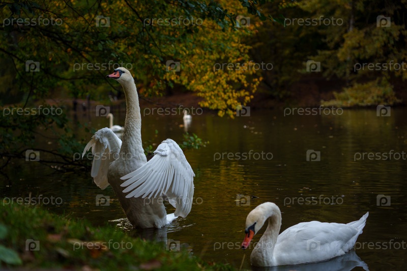 Лебеди в осеннем озере, окруженном разноцветной листвой