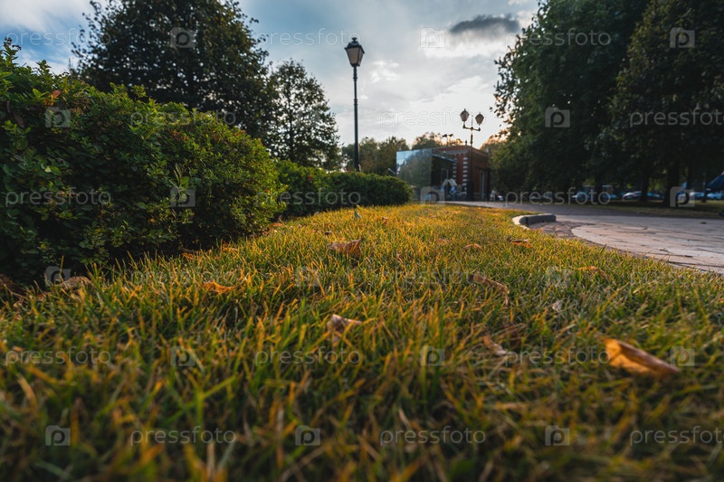 Осенний парк с опавшими листьями и деревьями в теплом солнечном свете