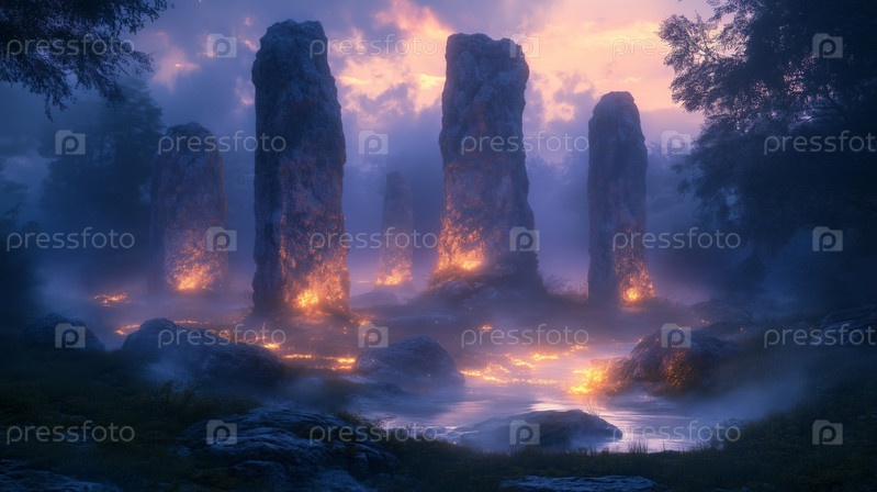 Светящиеся мегалиты, окруженные мистической рекой