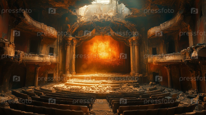 Заброшенный богато украшенный театр с ярко светящейся сценой
