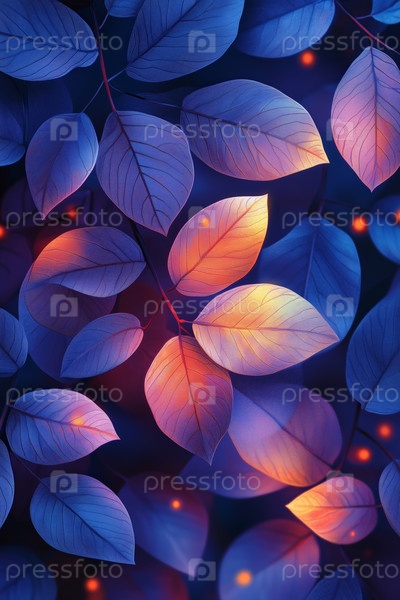 Абстрактные светящиеся листья в ярких синих и оранжевых тонах со светлыми пятнами